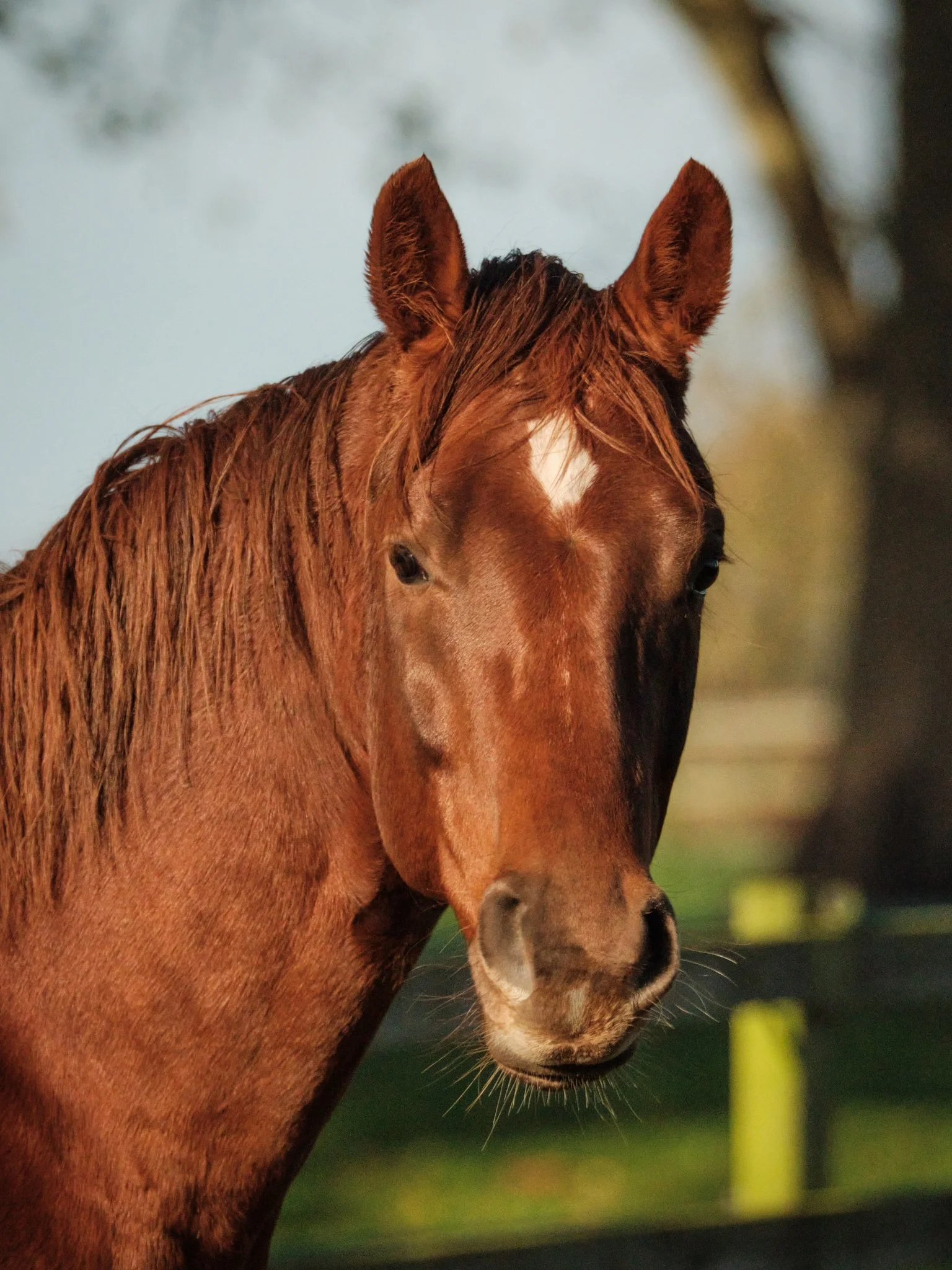 Close-up of a brown horse with a white star-shaped marking on its forehead, standing in a green field with trees and a wooden fence in the background.
