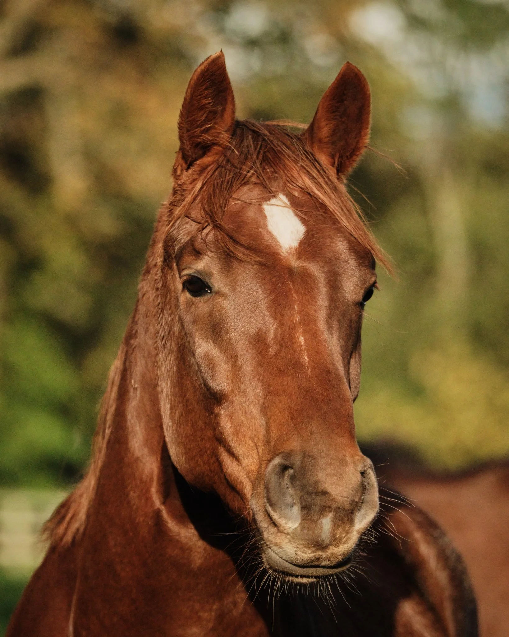Close-up of a dark brown horse with a white star-shaped marking on its forehead, standing outdoors with blurred trees in the background.