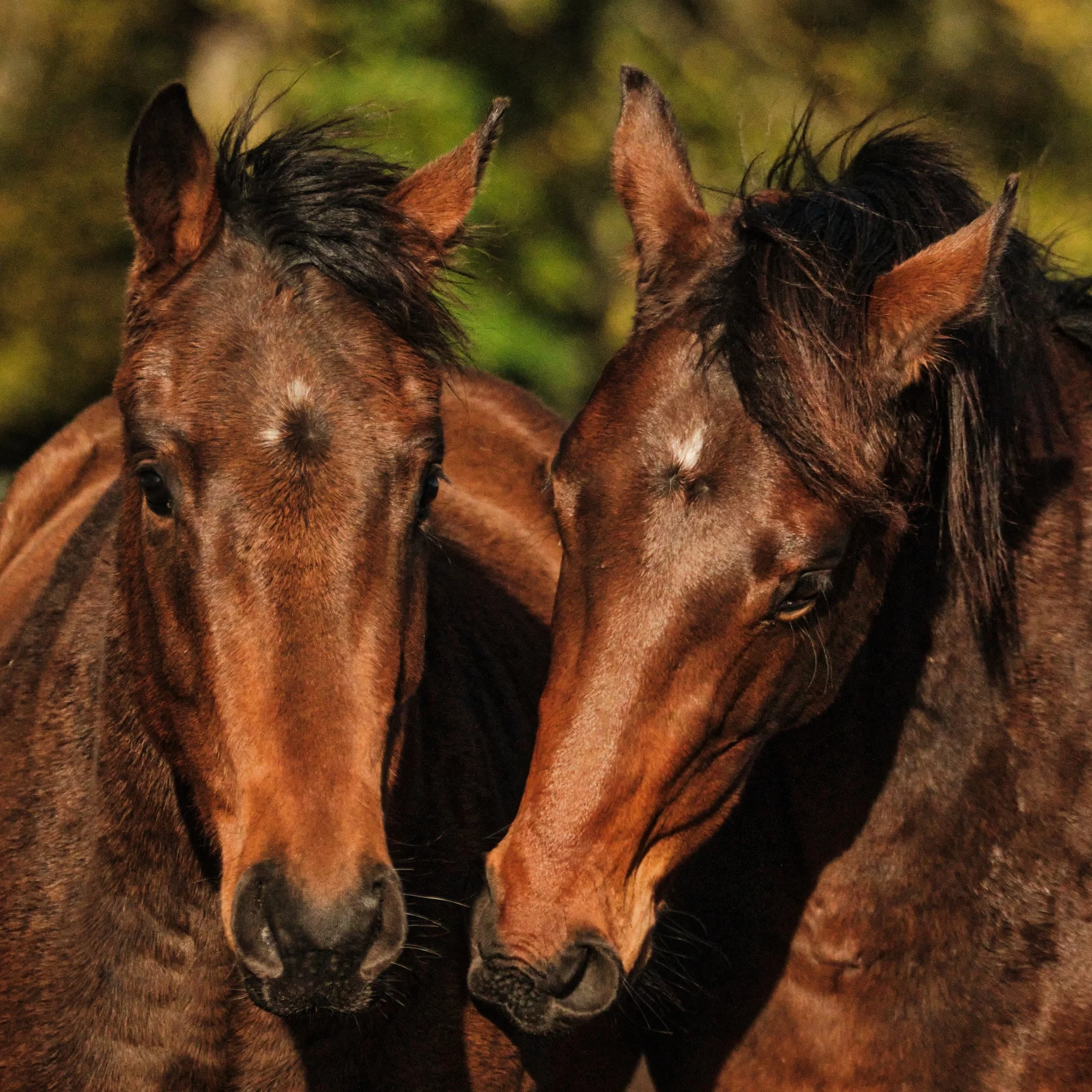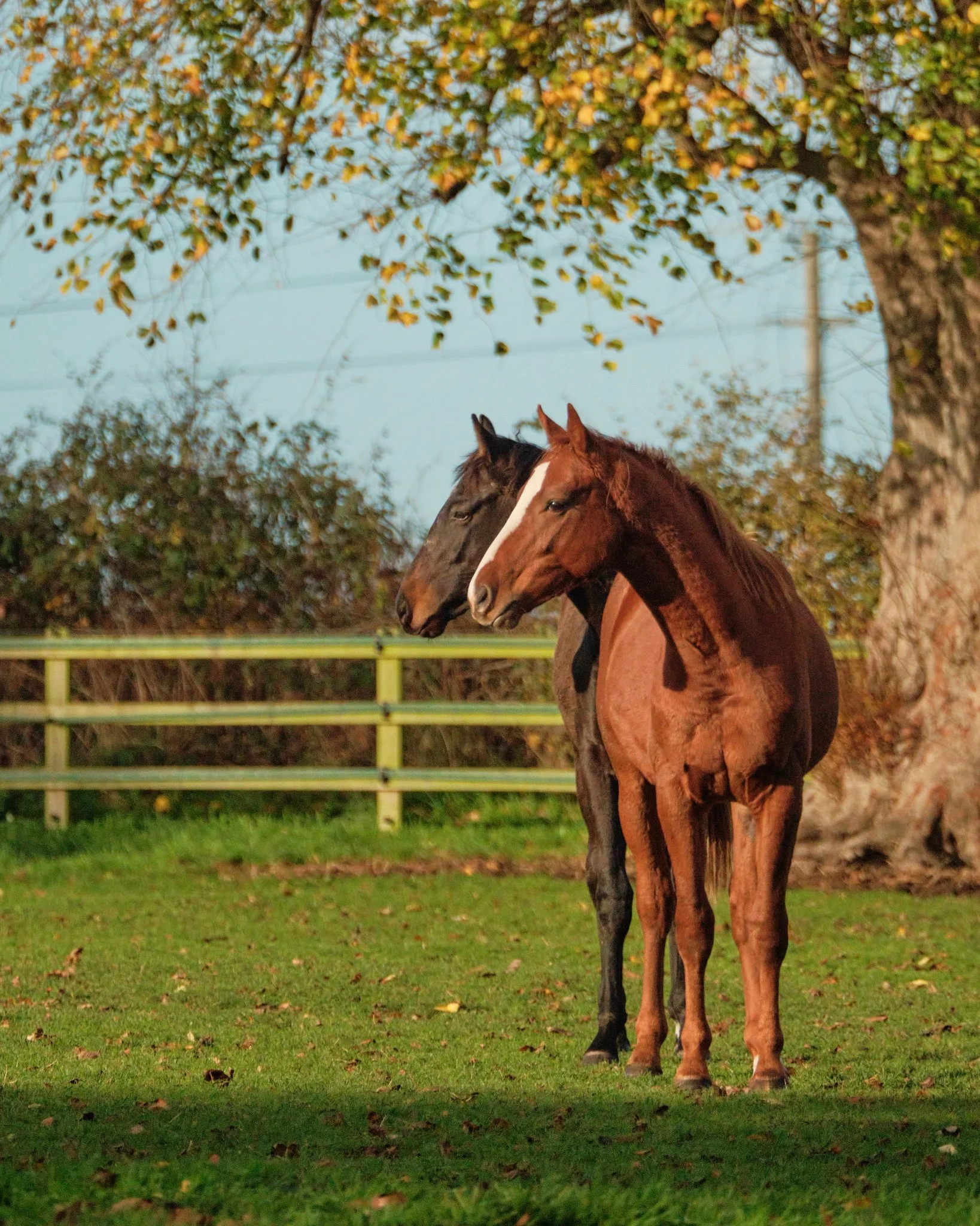Two horses, one chestnut and one dark bay, standing on grass in a shaded paddock with trees and a wooden fence in the background.