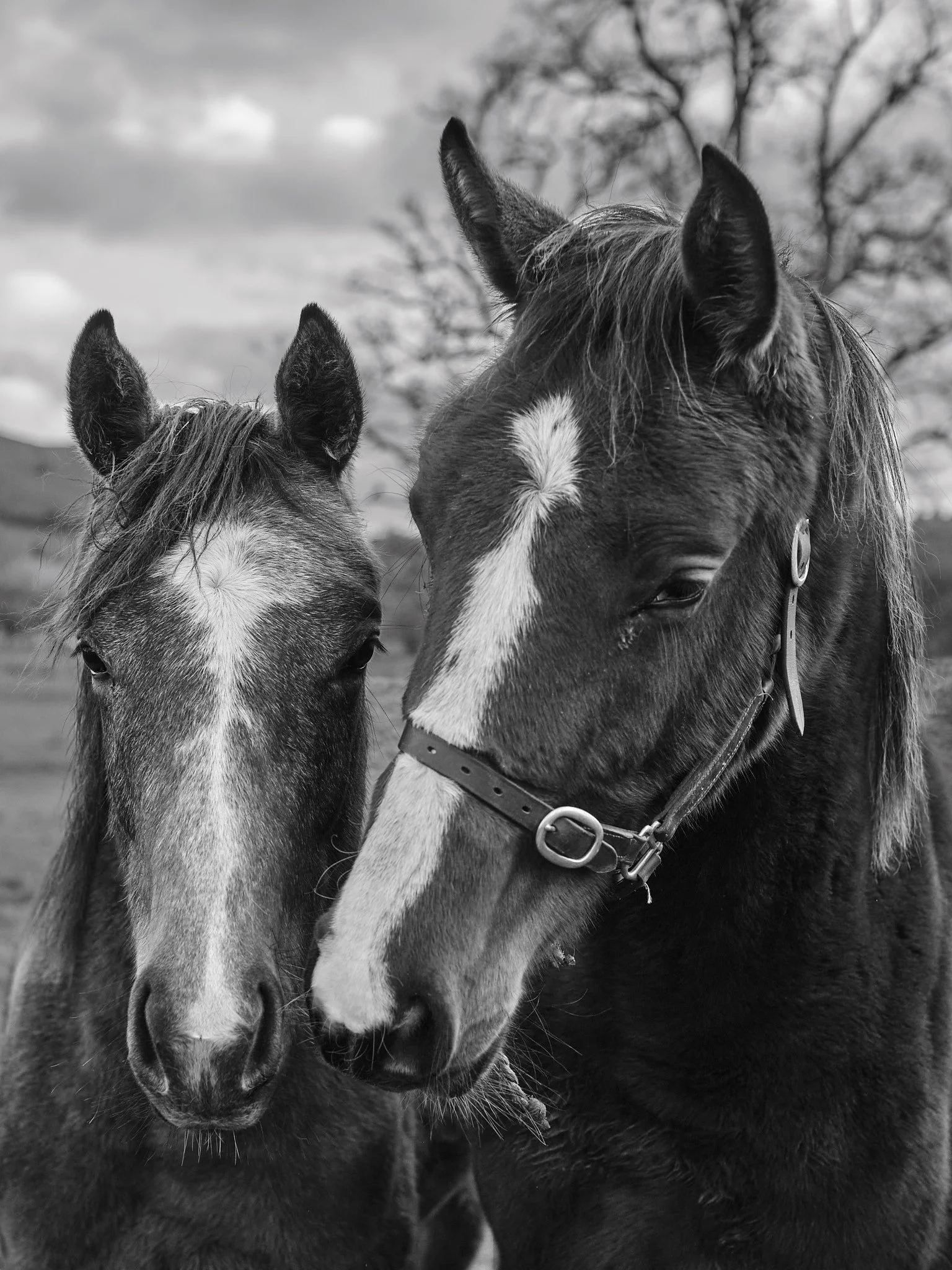 Two horses standing in a grassy field with trees in the background, in black and white. View fullsize